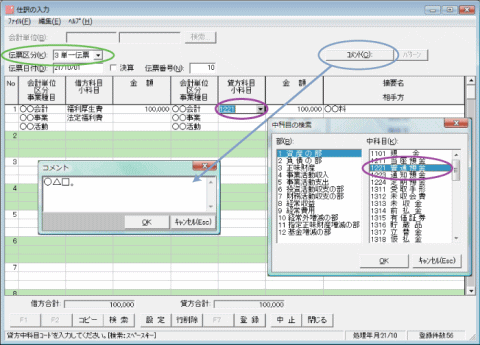 ■伝票は、単一(振替)伝票、入金伝票、出金伝票、複合伝票の4種類。伝票にメモを貼る感覚で使えるコメント機能も搭載しています。